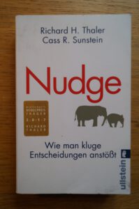 Mit dem «Nudge», auf dem Titelbild schubst ein grosser Elefant einen kleinen mit dem Rüssel sanft in die gewünschte Richtung, Anleihen beim Tierreich zu machen, entlarvt die Konsequenz dieses Programms bei allen guten Absichten: sprachbegabte Menschen etwa mit einer spezifischen Präsentation von Konsumgütern in einer Kaufhausauslage nonverbal zu manipulieren. Die Entscheidungen, die auf solche Manipulationen folgen, als wichtig zu bezeichnen, wirft vor allem die Frage auf: Für wen?